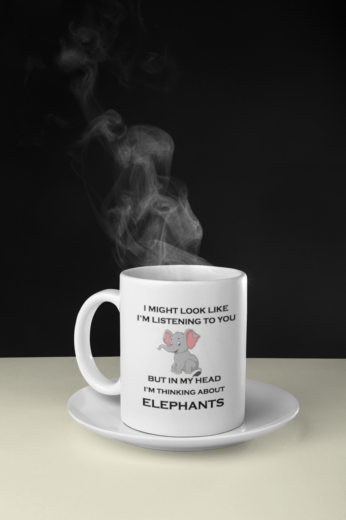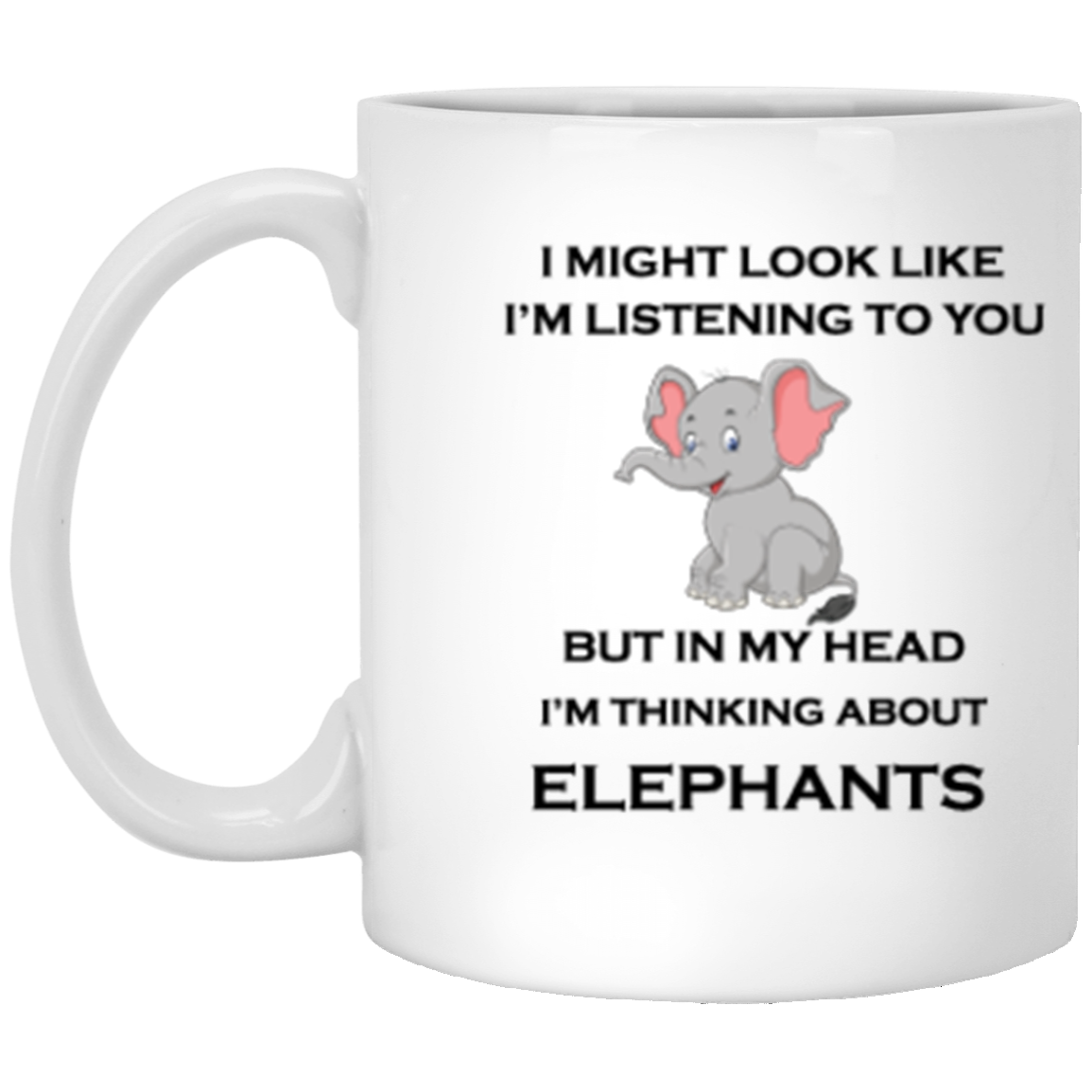 White Mug 11 oz. | Thinking About Elephants | Funny Elephant Mag | CC